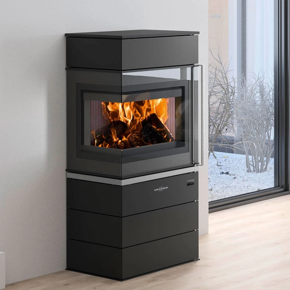 Der Kaminofen ORANIER O-Bloks (W+) besticht durch schlichte Eleganz aus schwarzem Stahl. Das moderne Design bildet den Rahmen und erlaubt die über Eck gebogene Glastür einen imposanten Blick auf das flackernde Flammenspiel. Die Auskleidung des Feuerraums besteht aus weißer Schamotte und unterstreicht das edle Gesamtbild.