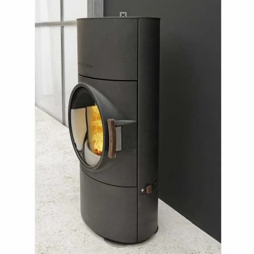 Besonders augenfällig wird allerdings das Design die große runde Sichtscheibe, durch die sich der Feuerschein dieses Schwedenofens im Raum verbreitet. Dieses aus dem Industrie-Design bekannte Ausstattungsmerkmal gibt dem Ofen eine markante vielleicht sogar etwas maritime Ausstrahlung. Insbesondere die Idee, die runde Ofenscheibe erhaben aus dem ansonsten ovalen Korpus hervorstehen zu lassen, unterstreicht die extravagante Anmutung dieses schönen Kaminofens.