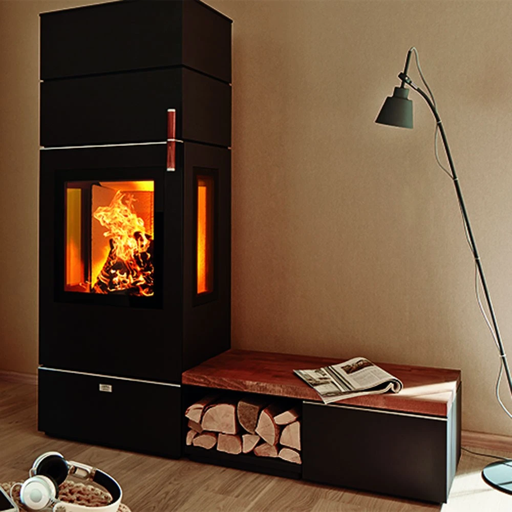 Der Kaminofen Cera Design Santos plus stellt eine extravagante Kombination von Kaminofen und Möbel dar. Mit seinen kompakten Maßen, den sehr klaren Linien sowie den optionalen Seitenteilen wird er zum Mittelpunkt jeden Wohnraums. Das Besondere: Der von drei Fenstern umgebene Feuerraum bringt leichte Transparenz und Feuergenuss von allen Seiten.