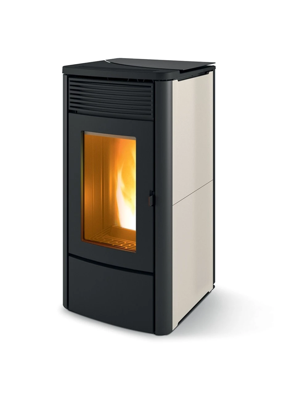 Pelletofen mit modernem Look, mit Topplatte aus Gusseisen und Seitenteilen aus Keramik in den Farben Warm Grey, Bordeaux und White. Moderner Pelletofen mit Keramikzündkerze, die um 40% reduzierte Einschaltzeiten gewährleistet. Abschaltfunktion der Ventilation. Wahlmöglichkeit zwischen Handheld-Fernbedienung (Zubehör), Bedientafel (Zubehör) oder Nutzung des eigenen Smartphones.