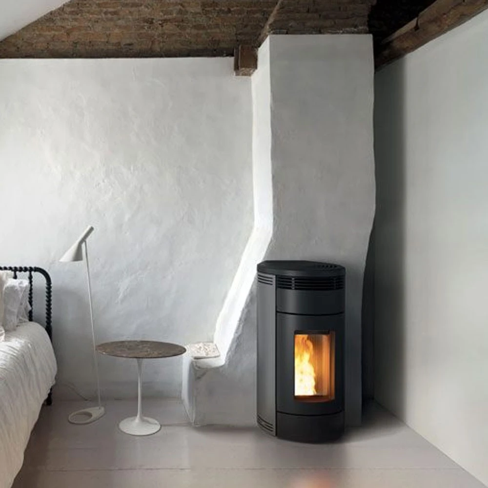 Der Pelletofen MCZ LOOP ist ein Warmluftofen mit elliptischer Form und luftdichter Konstruktion mit einer Höhe von etwas mehr als einem Meter Topplatte und Front sind aus Gusseisen, die Seitenteile sind aus in den Farben Schwarz oder Silber lackiertem Stahl. Belüftungsgitter auf der Topplatte, auf der Front und auf den Seitenteilen sorgen für eine optimale Wärmeverteilung. Die auf Führungen gleitende Topplatte gestattet eine problemlose Befüllung des Pelletbehälters.